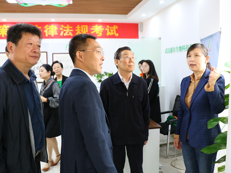 2019年4月23日,原湖北省政协副主席周宜开,湖北省卫生厅厅级巡视员孙昌松,湖北省卫健委副巡视员、湖北省预防医学会会长高忠明、副秘书长杨连弟、学术部彭玲主任一行莅临惠尔生物考察调研、指导工作。一元堂国际健康产业集团董事长蔡凯先生、总裁秦焕龙先生、武汉惠尔生物科技有限公司董事长喻小军教授等为周副主席一行全程陪同讲解。