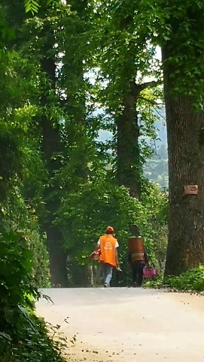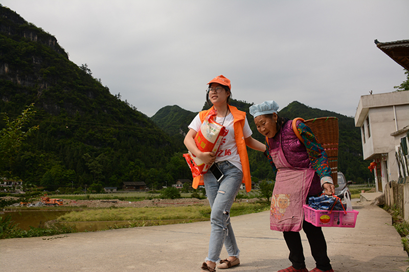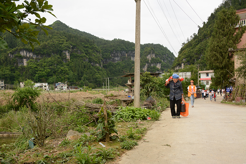 有位79岁的老奶奶,用背篓背着近40斤重受捐物质,弯腰驼背艰难行走,被我们的李小丹看到,立马跑上前去,一手抱起米袋,一手挽着老奶奶,步行近3里路,将老奶奶送回家,这一幕刚巧被来自长沙的健康之星张恢仁先生抢拍到发在群内。她的小小善举、一片丹心,感动了缬草之旅团的每个人,被张先生誉为“惠尔最美背影”。