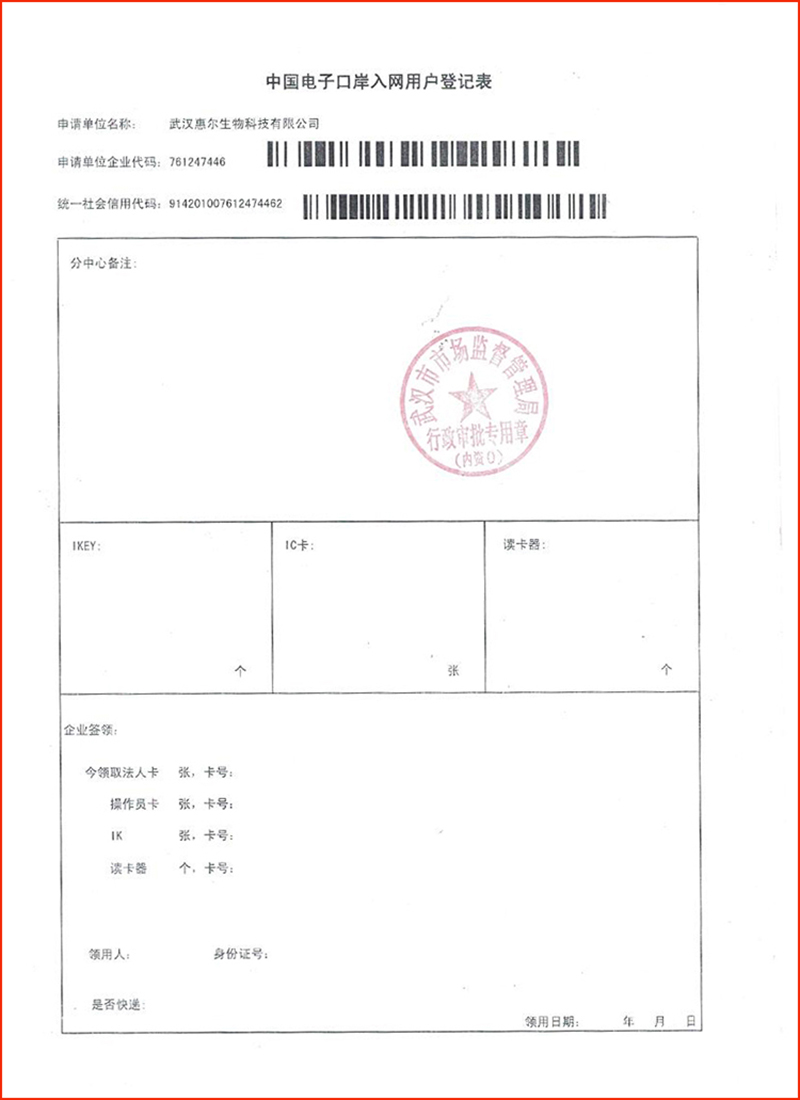 6月3日,到武汉市市场监督管理局完成“中国电子口岸入网用户登记”,取得《中国电子口岸入网用户登记表》。